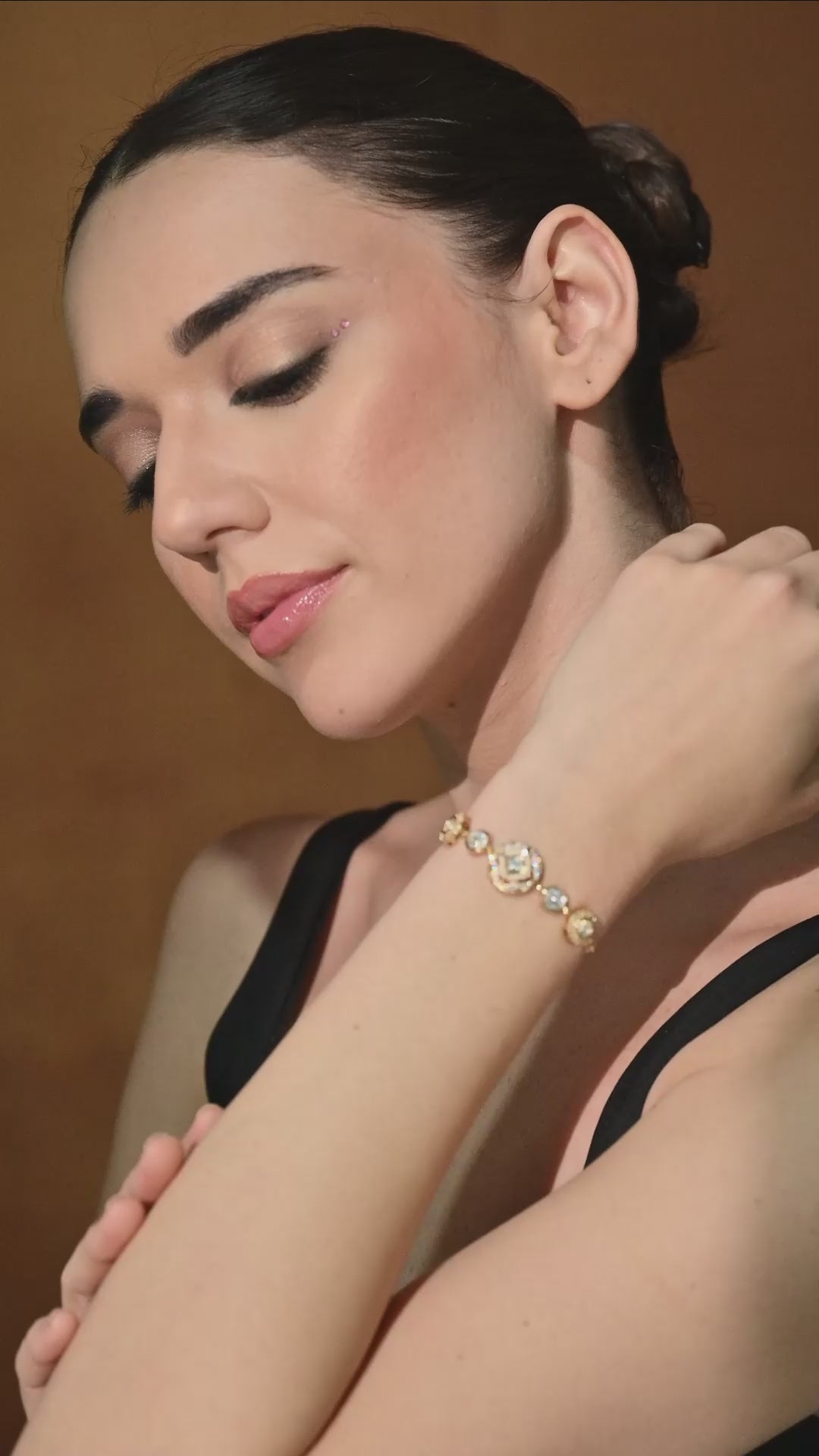 Delicate, graceful, and beautifully detailed, the Ivory Charm Bracelet is designed to add a soft glow to your wrist. The centerpiece features a diamond-shaped stone framed with tiny pearl-like accents, creating a refined vintage-inspired look. Flanked by circular crystal-set links, the bracelet flows seamlessly in a warm gold-tone finish. Elegant yet lightweight, this piece is perfect for festive occasions, celebrations, or to elevate your everyday style with subtle sophistication.