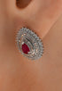 Shine with timeless beauty wearing the Ruby Radiance Teardrop Studs. These exquisite earrings feature a deep ruby-red teardrop gemstone surrounded by a halo of sparkling crystals, set in elegant silver plating. Perfect for weddings, celebrations, or a touch of luxury in everyday wear.