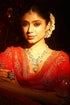 Make a statement wearing Sayda's Mohini Necklace set. Crafted with exquisite Kundan work and whitestones, with green gold plated work.This set features intricate detailing, making it perfect for special occasions. Exude glamour and sophistication with this timeless piece.