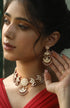 If you are looking for a necklace set with intricate work details and a heavy look, our latest Kundan necklace set with matching hanging earrings is what you need for this festive season. This set comes with white pearl and ruby stones in ruby polish to enhance its beauty to another level.